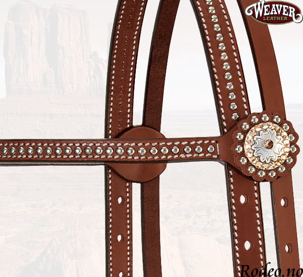 Dette hodelaget er laget i beste 3/4" (1,9 cm) lær. Dobbeltsydd med "nagler" og Sterling Silver conchos og spenner med Swarovski krystaller. Hodelaget har en smidig dobbeltsydd pannereim. Spenner og Conchos er belagt med en beskyttende overflate behandling.