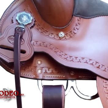 En kort allround sadel med et elegant kantmønster og flotte sølvdetaljer.